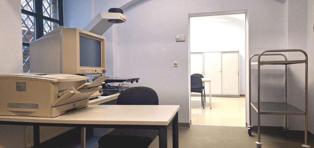 Auch wurde das Technikensemble rund um den Archivscanner und das Mikrofilmlesegerät im Foyer neu angeordnet.