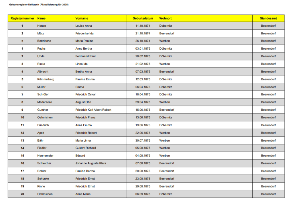 Im Rahmen der regelmäßigen Aktualisierung der hiesigen Standesamtsverzeichnisse durch das Stadtarchiv Delitzsch werden künftig die Verzeichnisse in überarbeiteter Form bereitgestellt. Die Arbeiten umfassen dabei alle Registertypen.